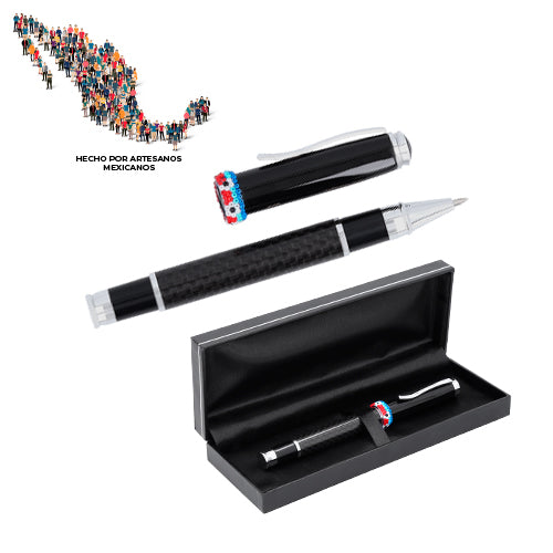 Bolígrafo de fibra de carbono con tapa metálica y estuche, decorado con arte huichol. Cada pieza está elaborada a mano con 120 chaquiras colocadas una a una por artesanos de Jalisco. Con cada compra apoyas el trabajo que representa el sustento económico de estas familias artesanas.. Medida producto alto: 14 . Medida producto ancho: 1.2 . Area impresion: 1 x 3.5 cm