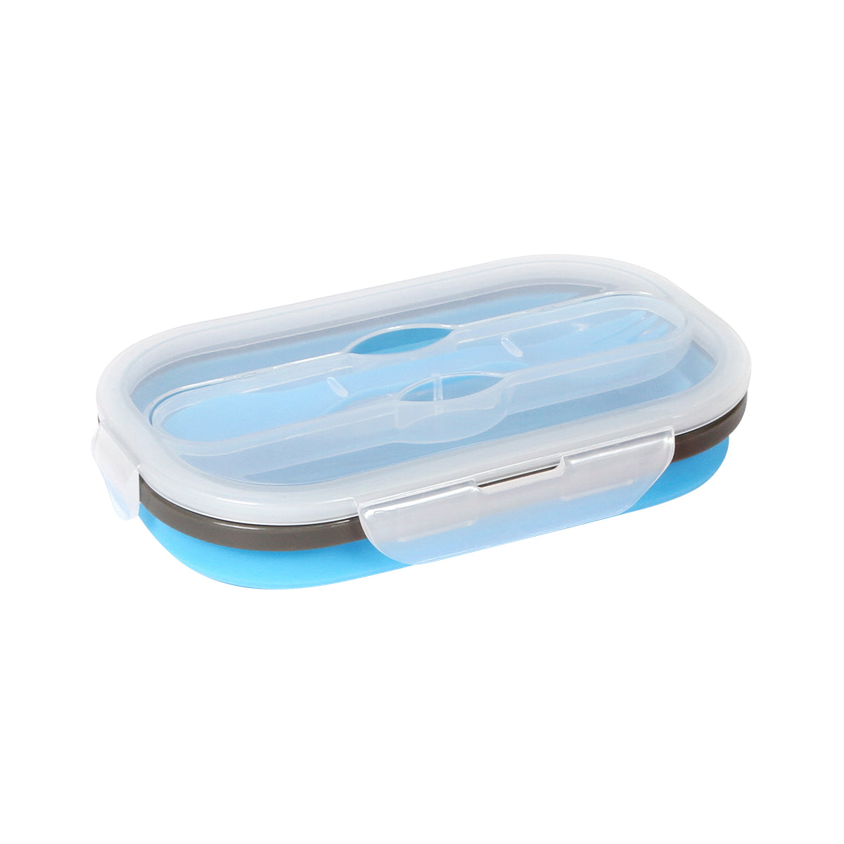 Contenedor de alimentos plegable fabricado en silicona. Cuenta con un broche de seguridad para un cierre hermético y un cubierto 3 en 1 cuchara, tenedor y cuchillo incluido.