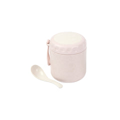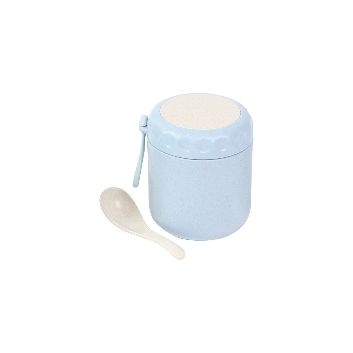 Contenedor de alimentos fabricado en polipropileno PP y fibra de trigo. Incluye cuchara y correa. Capacidad 380 ml.