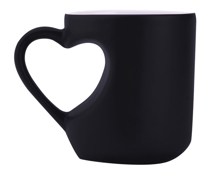 Taza mágica de sublimación con asa en forma de corazón. El diseño aparece al servir agua caliente. CAP. 10 OZ. Temperatura y Tiempo sugeridos para sublimar: 190 grados 120 seg. Venta en múltiplos de 12.