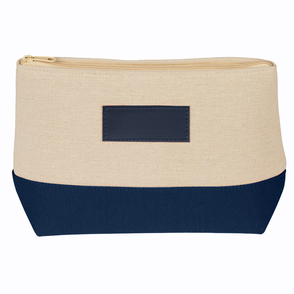 Cosmetiquera fabricada de la combinación de materiales de yute y lona de algodón. Cuenta con un compartimiento principal con cierre.