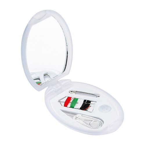 Incluye ensartador de aguja, botón, hilo, aguja, seguro y estuche con espejo.. Medidas: 7.7 x 5.4 cm . Material: Plástico