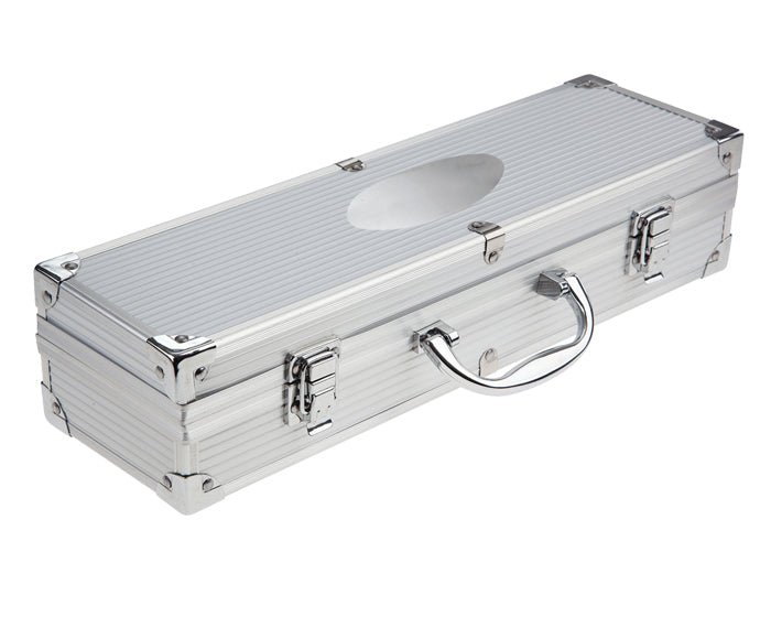 Estuche de aluminio con juego de BBQ. Incluye: tenedor, volteador, pinzas y brocha. Presentación: caja en color blanco.