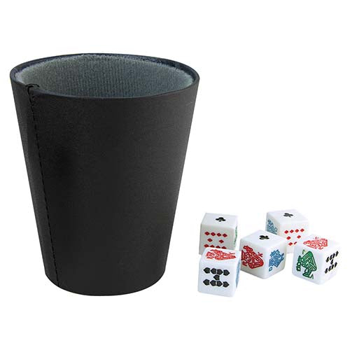 Incluye 5 dados.. Medidas: 7.5 x 8.7 cm . Material: Curpiel Vaso / Plástico Dados