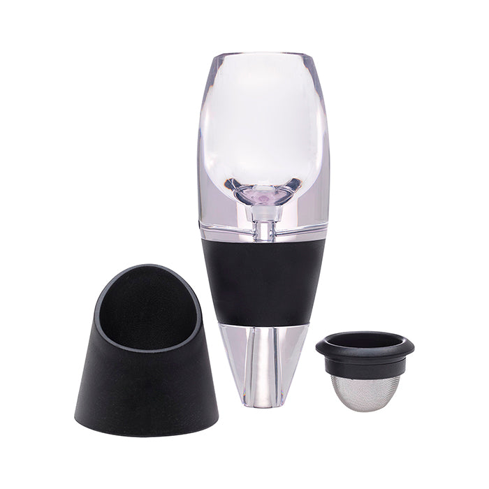 Decantador de vino con base fabricado en plástico ABS y silicona, diseñado para permitir una adecuada oxigenación del vino y mejorar su sabor y aroma. Cuenta con una rejilla interna que ayuda a filtrar las impurezas y sedimentos.