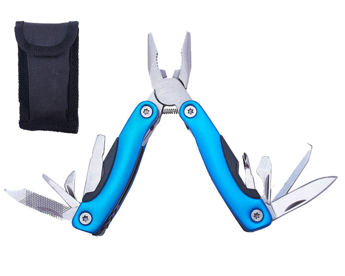 Herramienta plegable con 9 funciones. Incluye: pinzas de punta, 2 desarmadores planos, desarmador de cruz, cuchillo, sierra, destapador doble, lima y cuña metálica. Con superficie antideslizante para mejor manipulación. Incluye estuche de tela. Presentación: caja en color blanco.