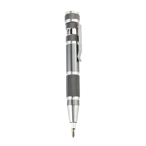 Desarmador de bolsillo con 4 puntas de cruz y 4 puntas planas diferentes e intercambiables. Incluye clip.. Medidas: 1.4 x 11.1 cm . Material: Metal