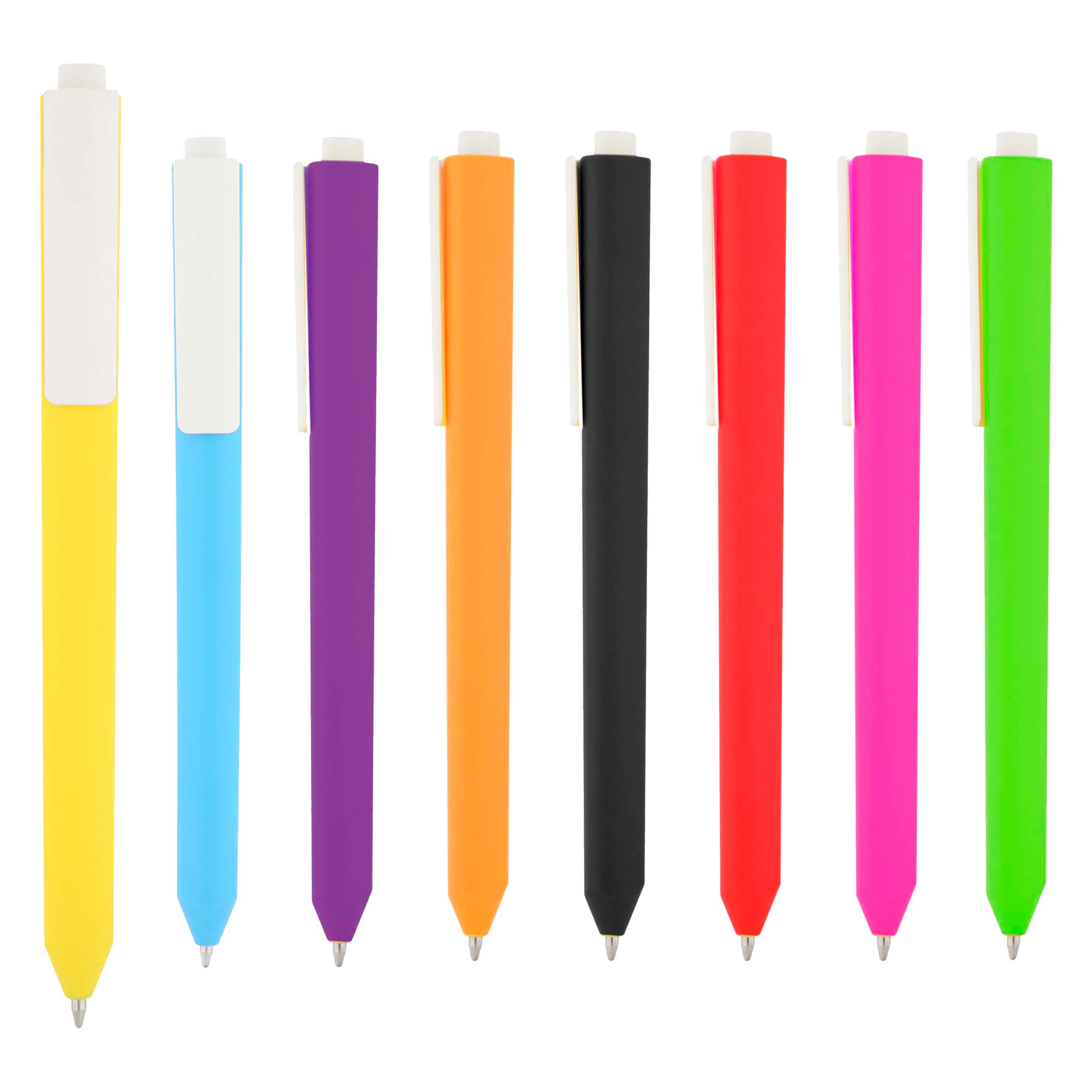 Bolígrafo de plástico de color sólido, con clip blanco y mecanismo de click.. Medida producto alto: 14 . Medida producto ancho: 1 . Area impresion: 4.5 x 0.7 cm