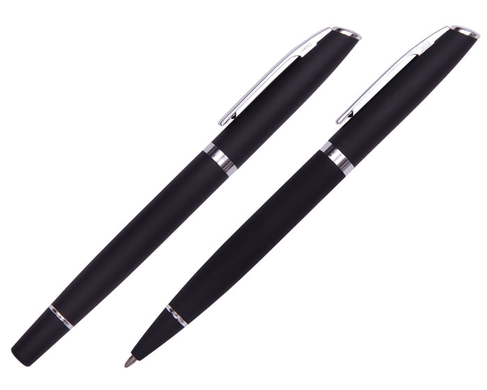 Set de Bolígrafos metalicos con recubrimiento de goma. Incluye bolígrafo tipo roller con tapa y bolígrafo con mecanismo retráctil. Detalles y clip metálicos. Presentación: caja en color negro. Medida de los bolígrafos 14 x 1.1 cm.