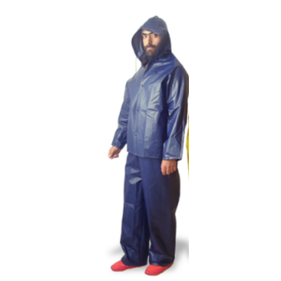 CARACTERÍSTICAS TÉCNICAS: Saco impermeable con capucha, cierra al frente con 4 broches de presión de plástico, capucha lleva jareta para su ajuste, manga ranglan. Pantalón con resorte en la cintura. COMPOSICIÓN: Equipo de 2 piezas, manufacturado en PVC con soporte textil con 35 mm de espesor, sellado en todas sus uniones con alta frecuencia para evitar filtraciones de agua. TALLA: Chica, Mediana, Grande, Extra Grande, T. Especiales. Con un logo tipo bolsillo -full color 1 TINTA