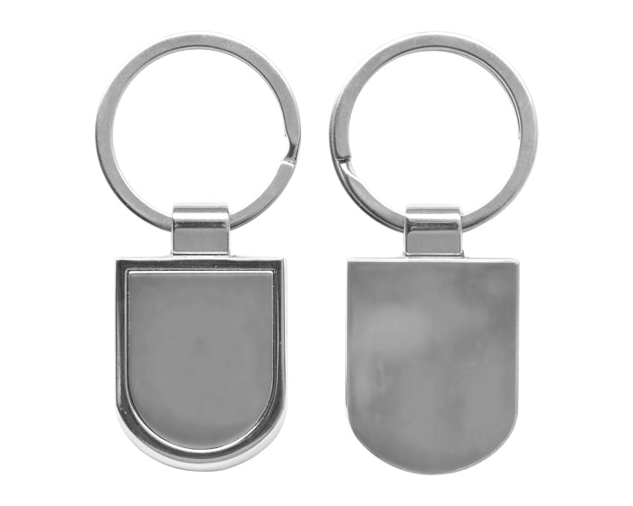 Llavero metálico en forma de escudo con arillo reforzado. Por su bajo relieve se pueden hacer aplicaciones en gota de resina. Presentación: caja individual en color negro.