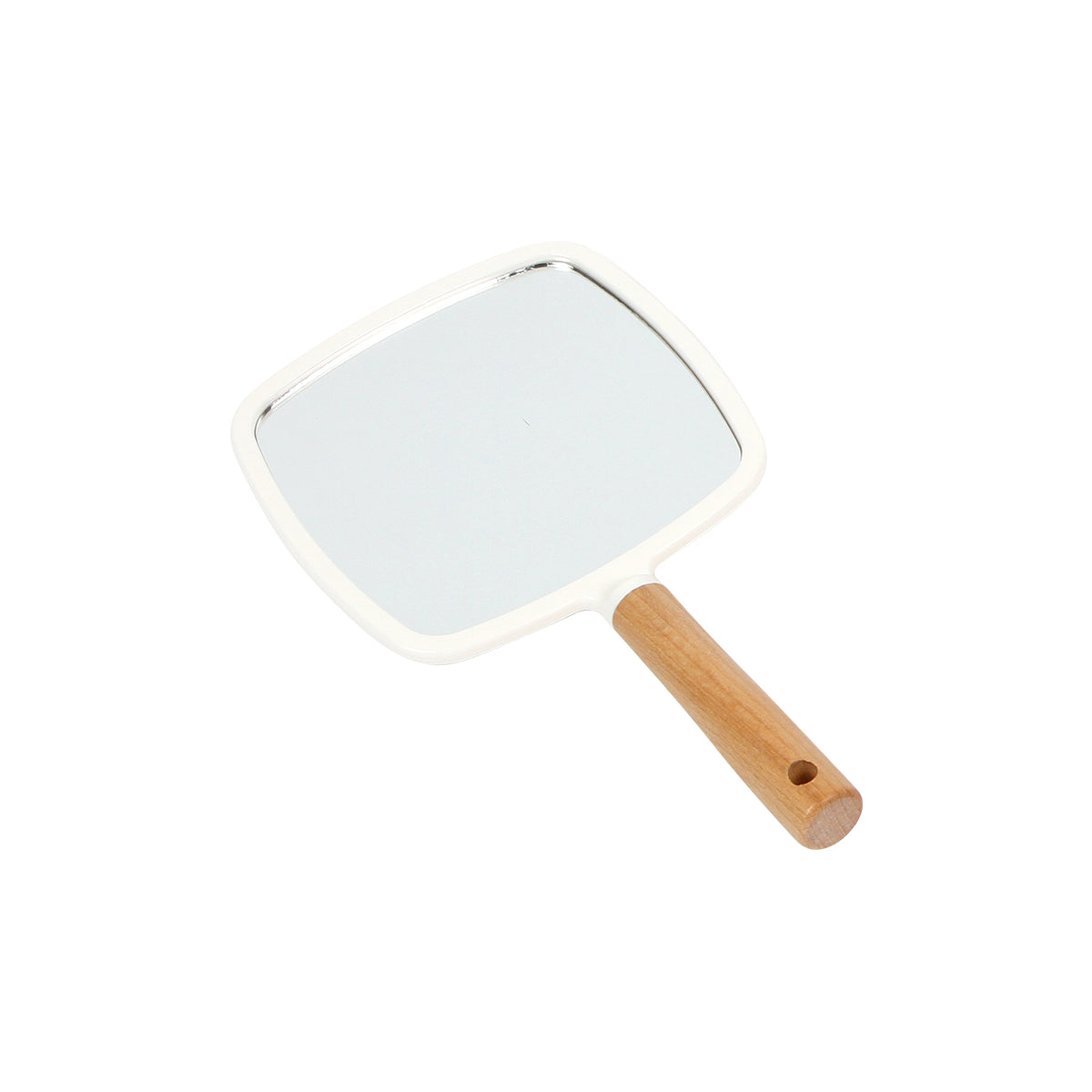 Espejo con forma cuadrada con puntas redondeadas fabricado en plástico tipo PS caracterizado por colores con acabados brillantes y es liviano. Cuenta con mango en madera con acabado en laca para una mayor protección y abrasión.