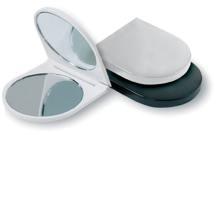 Espejo doble para bolsillo fabricado de plástico. Ideal para el bolso o la cosmetiquera.