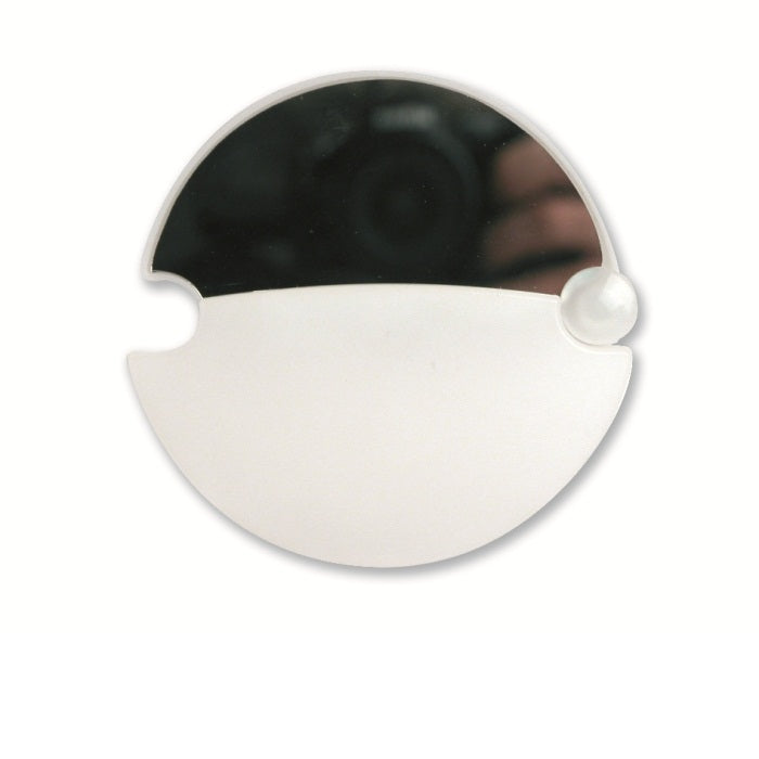 Espejo para bolsillo semicircular fabricado de plástico con tapa giratoria. Ideal para el bolso o la cosmetiquera.