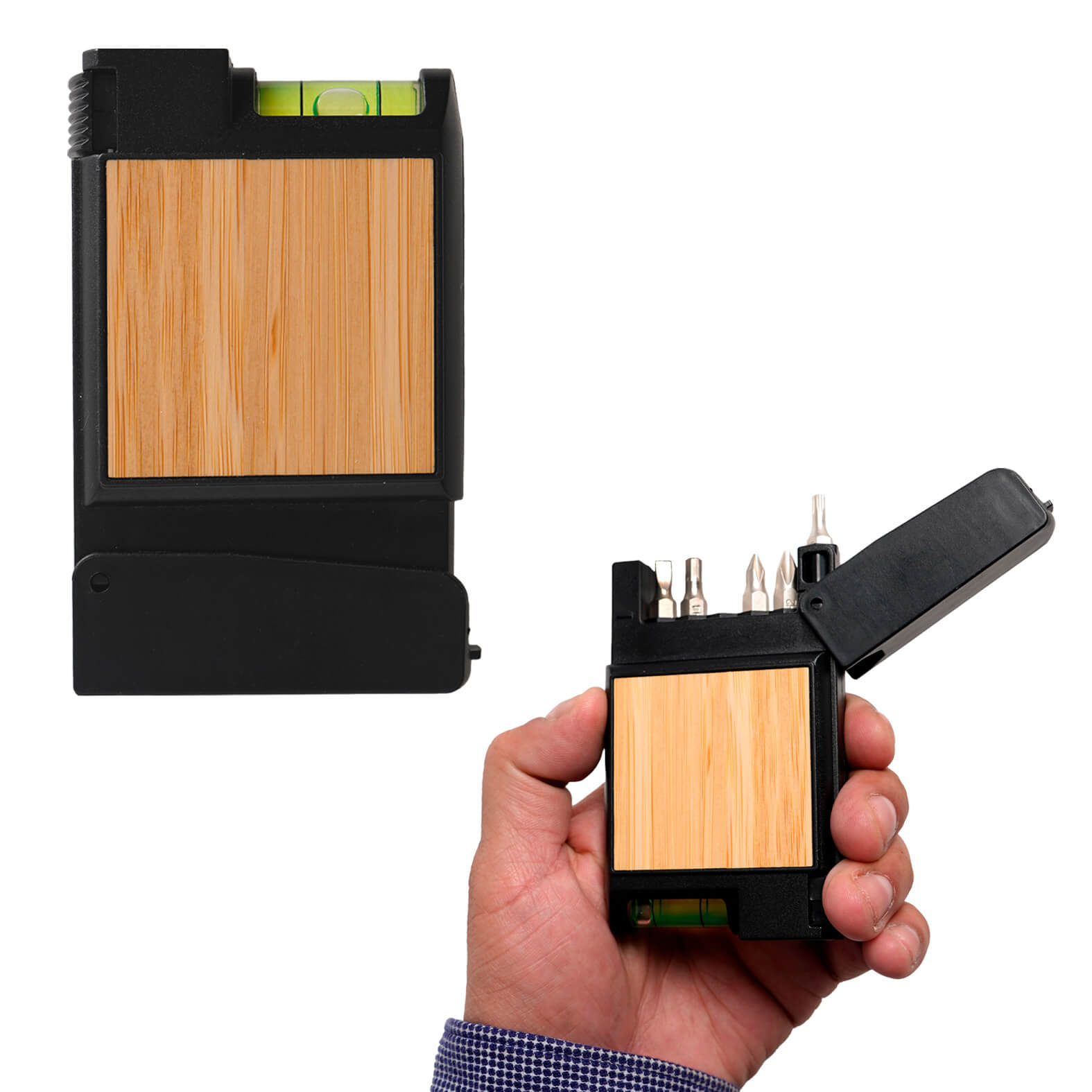 Set de herramientas con detalle de bambú. Incluye nivel de burbuja, flexómetro y desarmador con 6 puntas intercambiables.. Medida producto alto: 9.6 . Medida producto ancho: 6 . Area impresion: 4 x 3 cm
