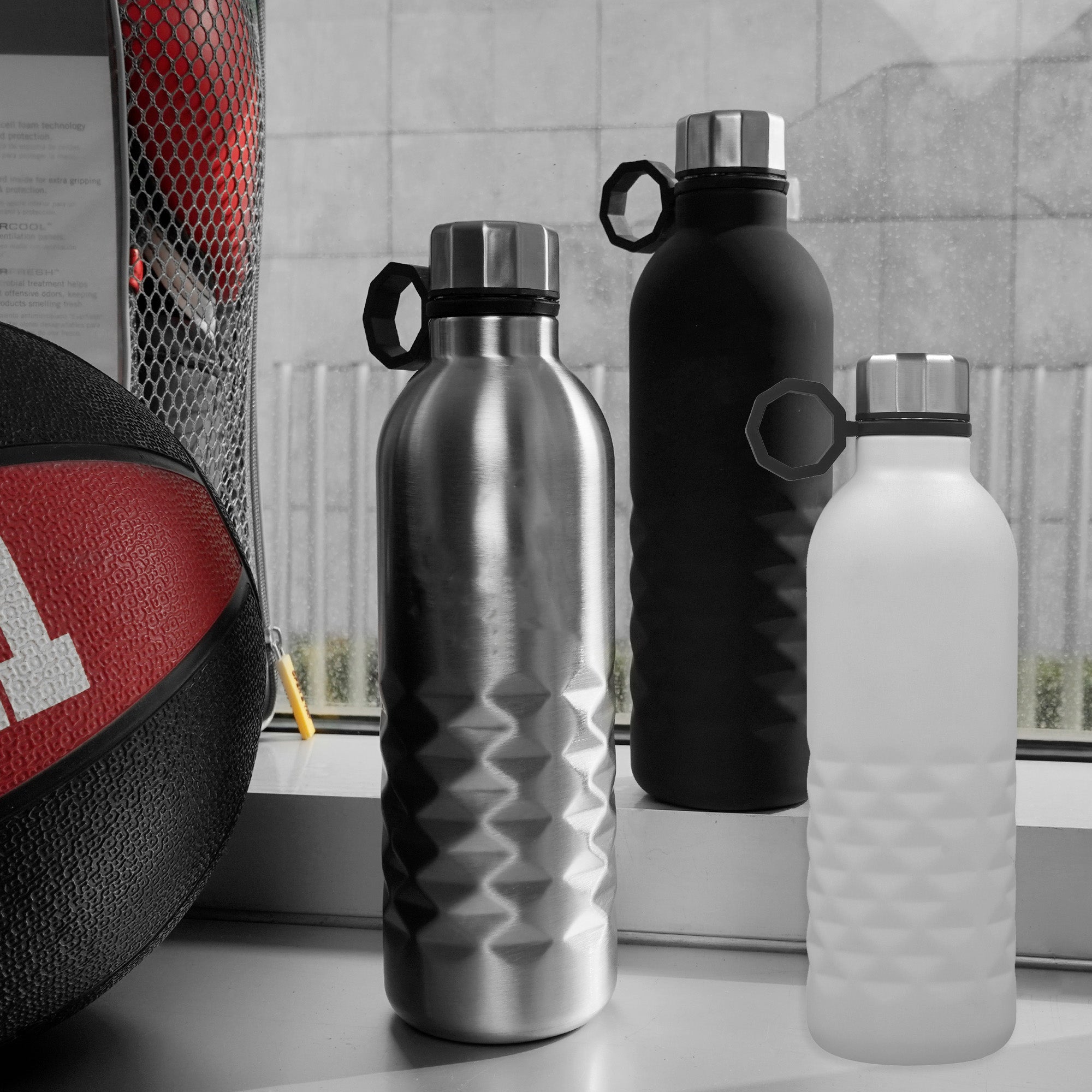 Termo de doble pared de acero inoxidable con asa de silicón en la tapa.. Medida producto alto: 24 . Medida producto ancho: 7.5 . Area impresion: 4 x 5 cm
