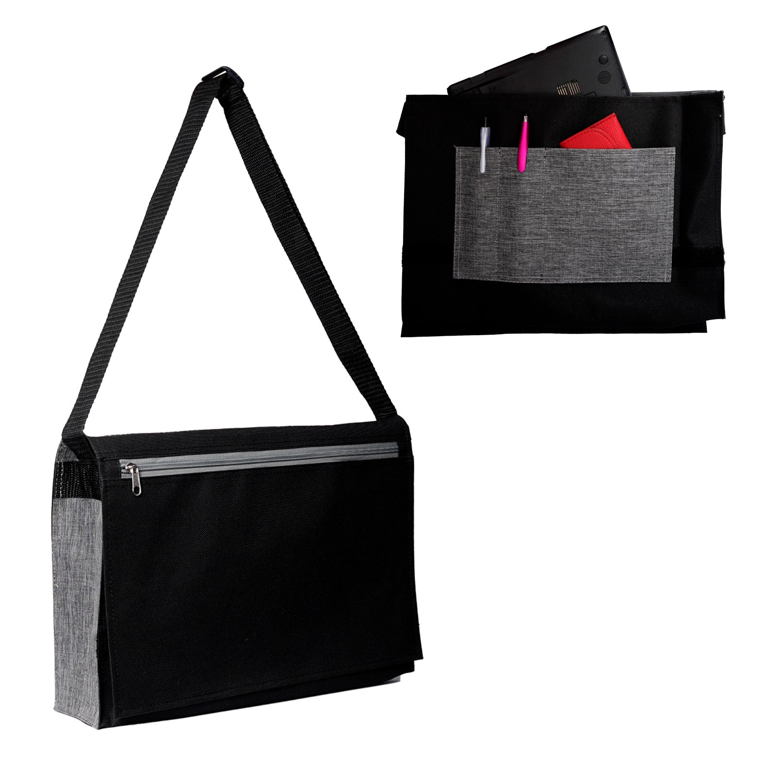 Portafolio con compartimento principal para laptop de hasta 15, organizador frontal, solapa con cierre de velcro, bolsa trasera con cierre y correa ajustable.. Medida producto alto: 26.7 . Medida producto ancho: 35 . Area impresion: 10 x 15 cm