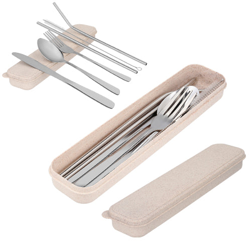 Set de cubiertos con estuche de wheat straw fibra de trigo que incluye: cuchara, tenedor, cuchillo, 2 popotes y cepillo, todos de acero inoxidable.. Medida producto alto: 6.2 . Medida producto ancho: 25 . Area impresion: 21 x 3.5 cm