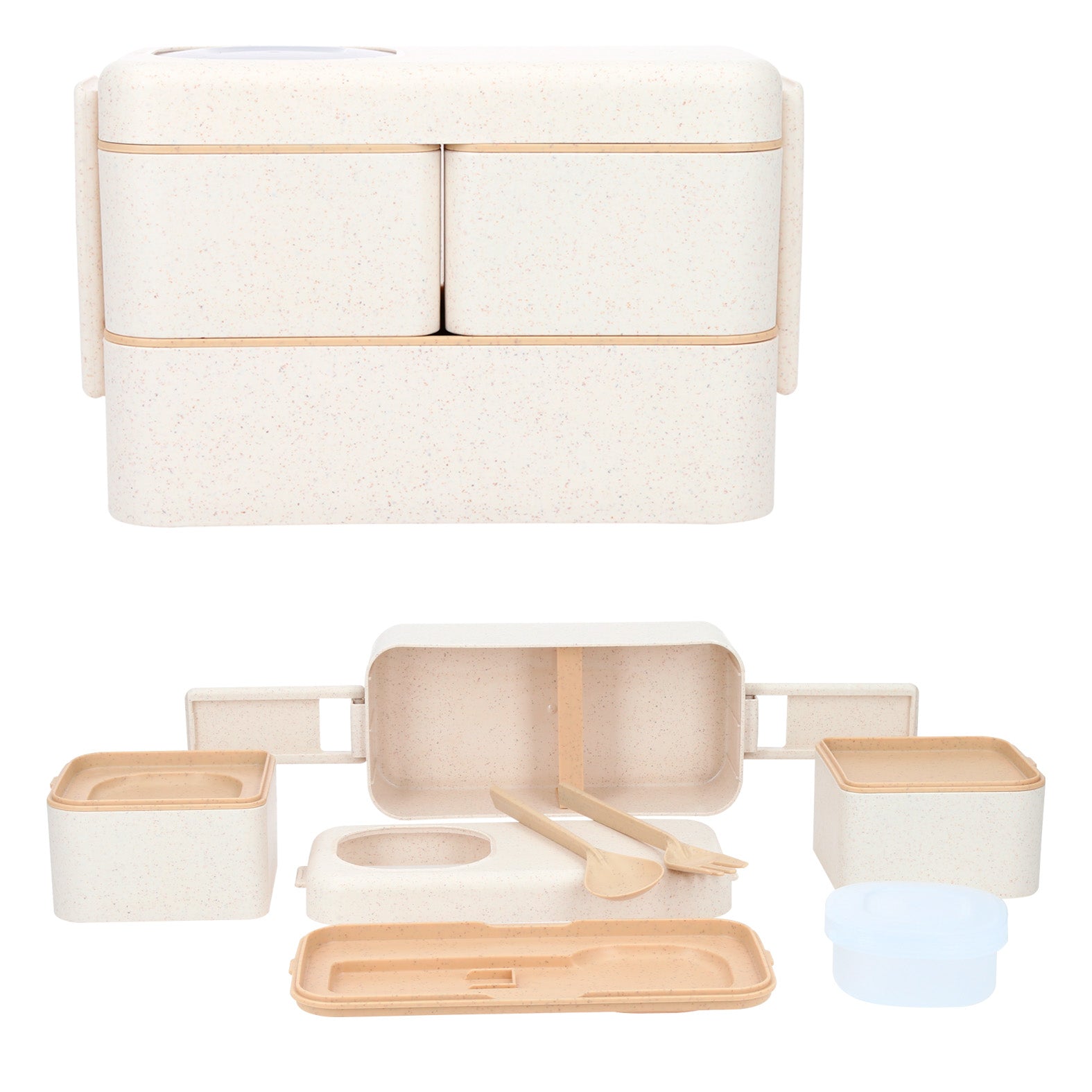 Contenedor de alimentos de weat straw de 2 niveles con 3 compartimentos ensamblables, un mini recipiente, espacio para cuchara y tenedor.. Medida producto alto: 8.7 . Medida producto ancho: 18.2 . Area impresion: 6 x 5 cm