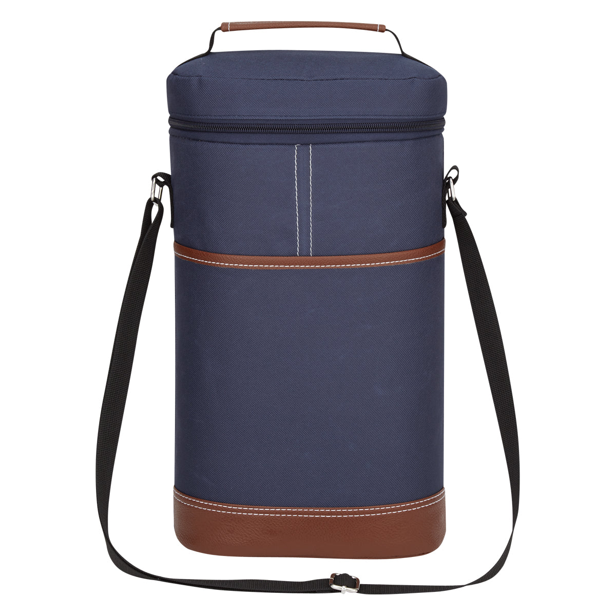 Hielera doble para botellas de vino fabricada de poliéster 600D, con revestimiento PEVA. Cuenta con un ribete de cuero sintético, correa de hombro ajustable y asa de transporte, compartimiento principal con cierre, bolsillo delantero, divisor interior plegable y un porta sacacorchos. Capacidad de 2 botellas.