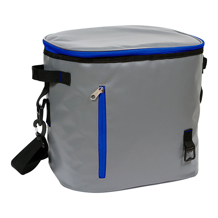 Hielera fabricada en PVC lona con destapador y compartimiento en el lado frontal, con correa ajustable y retirable, con asas en los costados para mayor comodidad al momento de transportar, cuenta con detalles de color en los cierres.