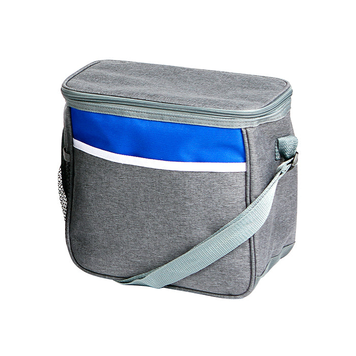 Hielera bi-tono de cierre, con correa de hombro ajustable fabricada en poliéster, con detalles de color en la parte frontal, con bolsillo de red en el costado de la hielera.