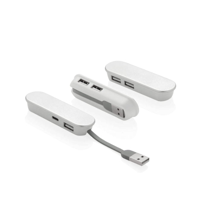 Hub USB 2.0 fabricado de aluminio y polipropileno. Cuenta con 3 puertos y un puerto tipo C 2.0, incluye cable de conexión. Diseño registrado. Empacado individualmente en caja de regalo XDDESIGN®.