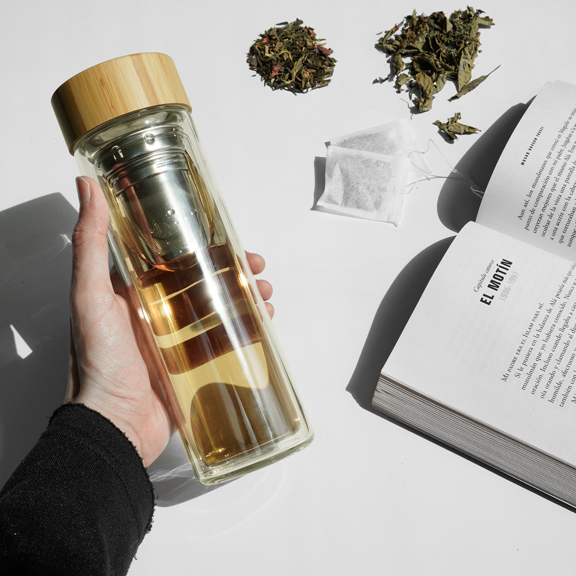 Termo con doble pared de vidrio e infusor, colador de metal y tapa de bambú enroscable.. Medida producto alto: 22.5 . Medida producto ancho: 7 . Area impresion: 9 x 13 cm