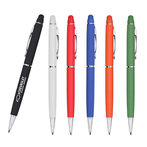 Bolígrafo metálico con acabado rubber y goma touch screen. Mecanismo retráctil.. Medida producto alto: 14.5 . Medida producto ancho: 1.2 . Area impresion: 1 x 4 cm