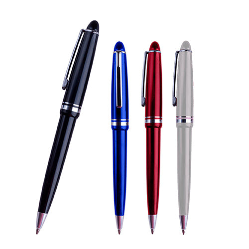 Bolígrafo de plástico con apariencia metálica y clip metálico.. Medida producto alto: 13.5 . Medida producto ancho: 1.2 . Area impresion: 0.8 x 3.5 cm