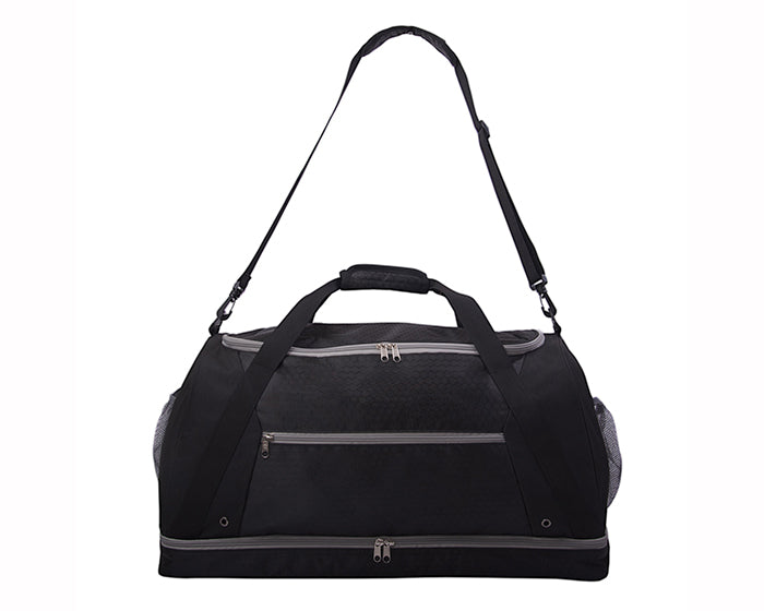 Maleta deportiva, con dos compartimentos, uno para guardar tenis o toalla y el segundo para objetos de viaje como ropa. Cuenta con dos bolsas laterales de malla, asa central ajustable y asa lateral.