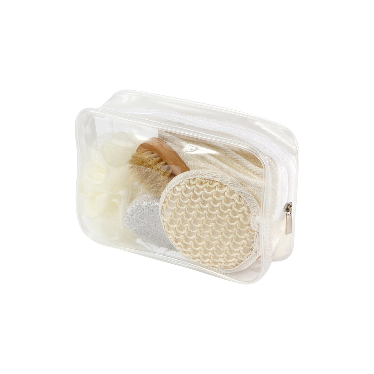 Disfruta una experiencia de cuidado personal con este kit que incluye: esponja corporal, cepillo de cerdas naturales, piedra pómez, esponja facial y tira para la cabeza. Ideal para limpiar, exfoliar y consentir la piel, todo en un estuche transparente práctico para regalo o viaje.