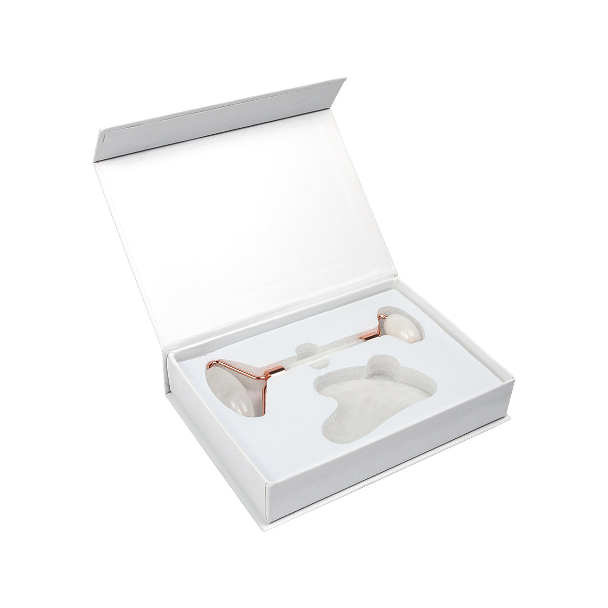 Juego de masajeadores para el rostro que incluye un rodillo fabricado en cuarzo blanco y acero con terminado rose gold, 1 gua-sha de cuarzo blanco, y una caja para regalo con suaje. La piedra de cuarzo blanco tiene propiedades calmantes y refrescantes para la piel, este producto ayuda a mejorar la circulación, reducir la hinchazón y promover un cutis más radiante. Este juego  te ofrece una oportunidad única de mimarte y cuidar de tu piel de una manera lujosa y relajante. Es perfecto para aquellos que buscan una rutina de cuidado facial efectiva, holística y elegante.