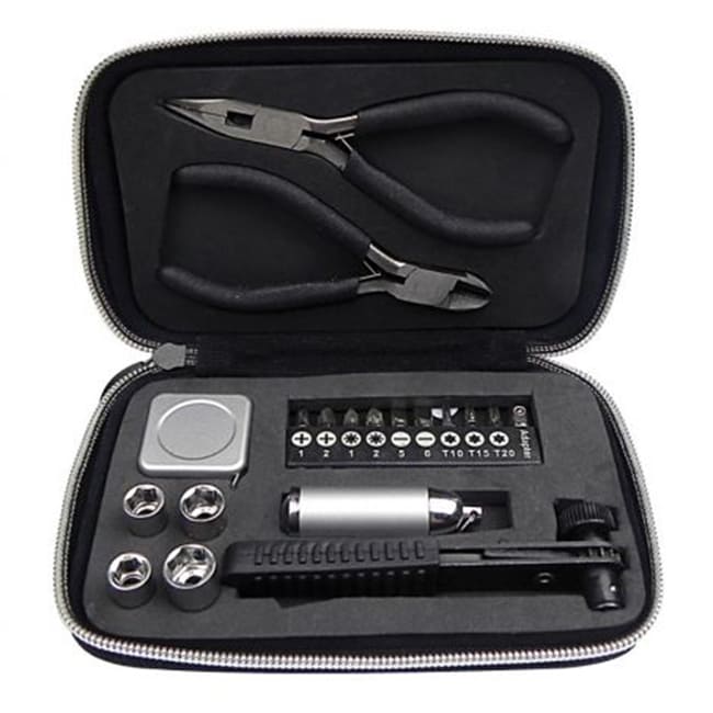 Kit Mustang Set de 19 piezas. Incluye : Linterna ; 2 Pinzas ; Juego de 10 puntas ; Cinta Métrica ; 4 Dados y Manguillo