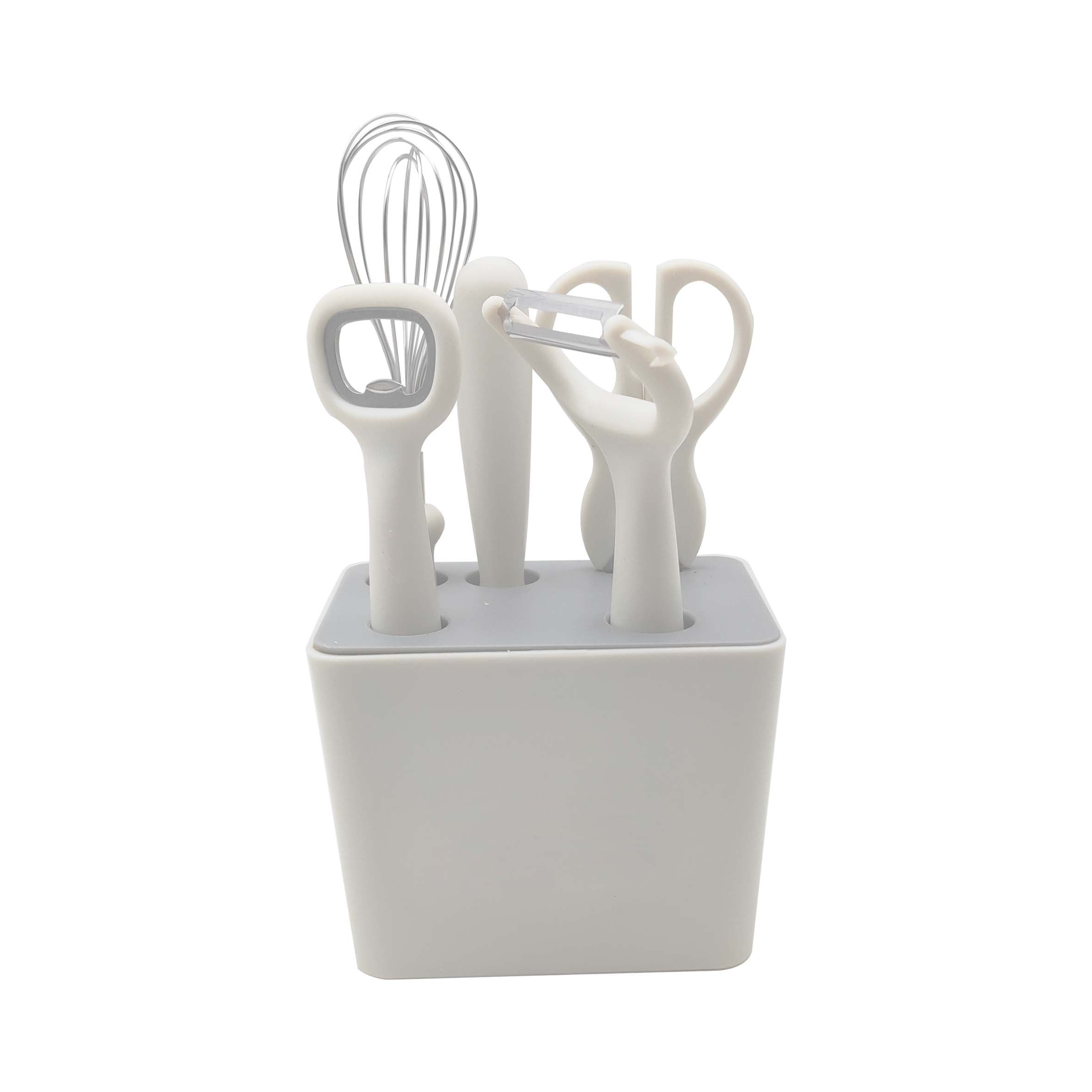 Kit para cocina que incluye cuchillo, batidor, tijeras, destapador, pelador y una base para soporte.. Medida producto alto: 10 . Medida producto ancho: 12.5 . Area impresion: 6 x 6 cm