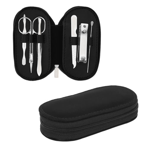 Set de manicure en estuche tipo gamuza con cierre que incluye: pinzas para depilar, tijeras, empujador de cutícula, lima, cortaúñas y limpiador de oídos.. Medida producto alto: 6 . Medida producto ancho: 11.2 . Area impresion: 7 x 3.5 cm