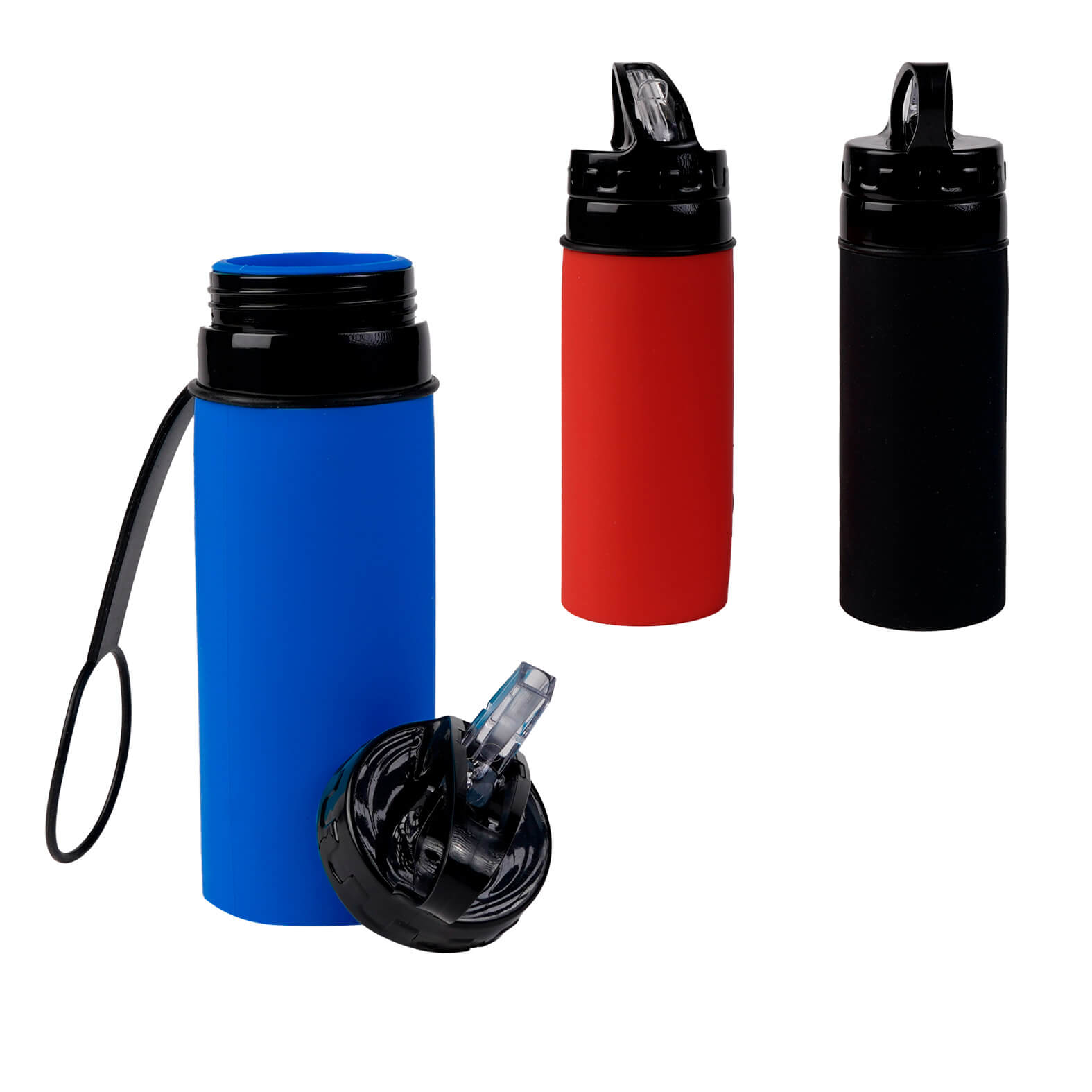 Cilindro de silicón, con tapa enroscable, boquilla abatible, agarradera en la parte superior y asa de silicón removible.. Medida producto alto: 21.5 . Medida producto ancho: 6.5 . Area impresion: 6 x 7 cm