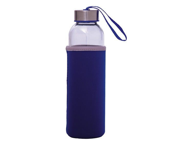Cilindro de vidrio con tapa de rosca y jareta de tela en color. Funda de Neopreno en colores. CAP. 500 ml. Presentación: caja en color blanco.