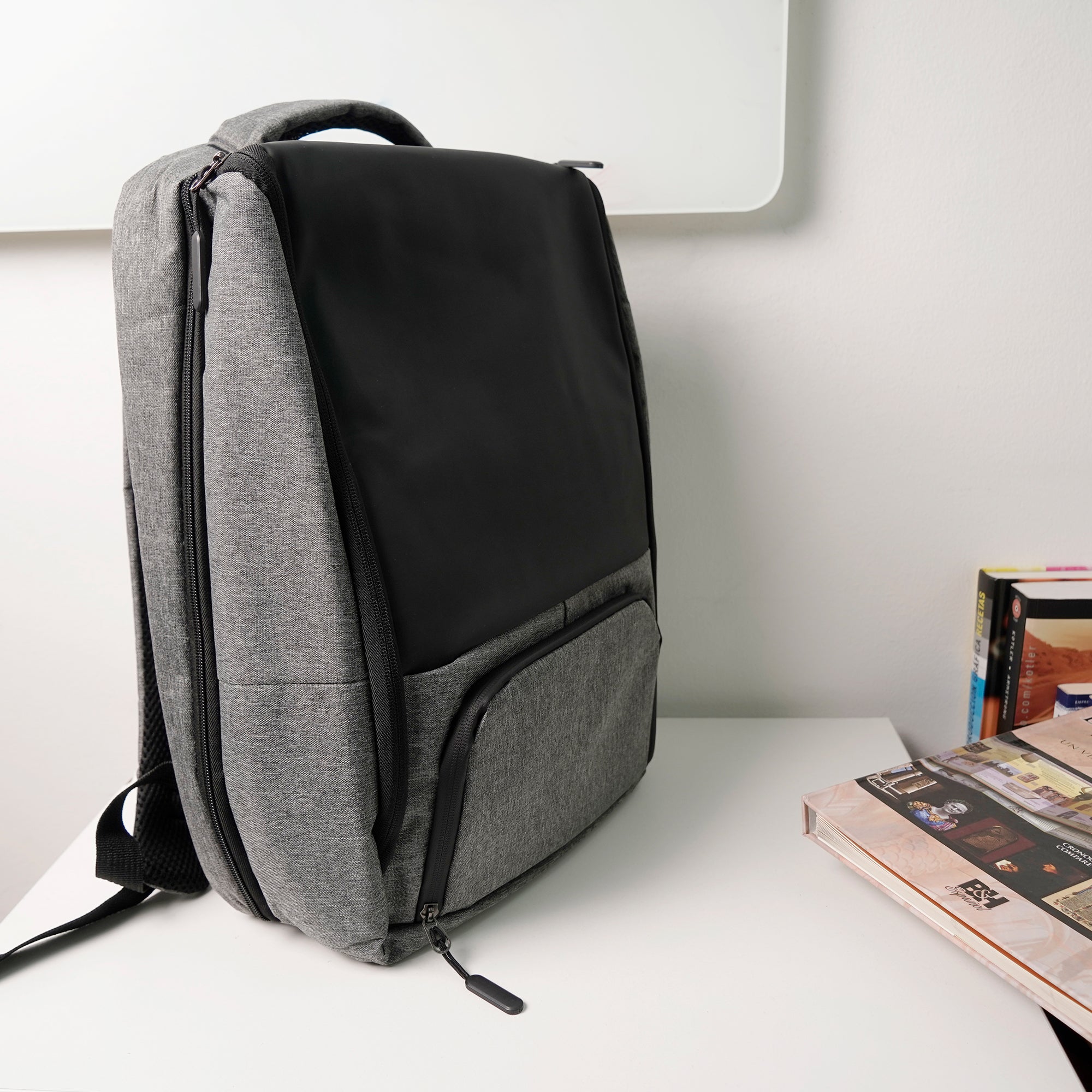 Mochila de poliéster y vinipiel que abre a 330 grados con asa, cierres plastificados, 2 compartimentos laterales, 1 compartimento frontal con cierre, compartimento interno para laptop max. 16 pulgadas y tirantes acojinados.. Medida producto alto: 51 . Medida producto ancho: 29 . Area impresion: 12 x 10 cm