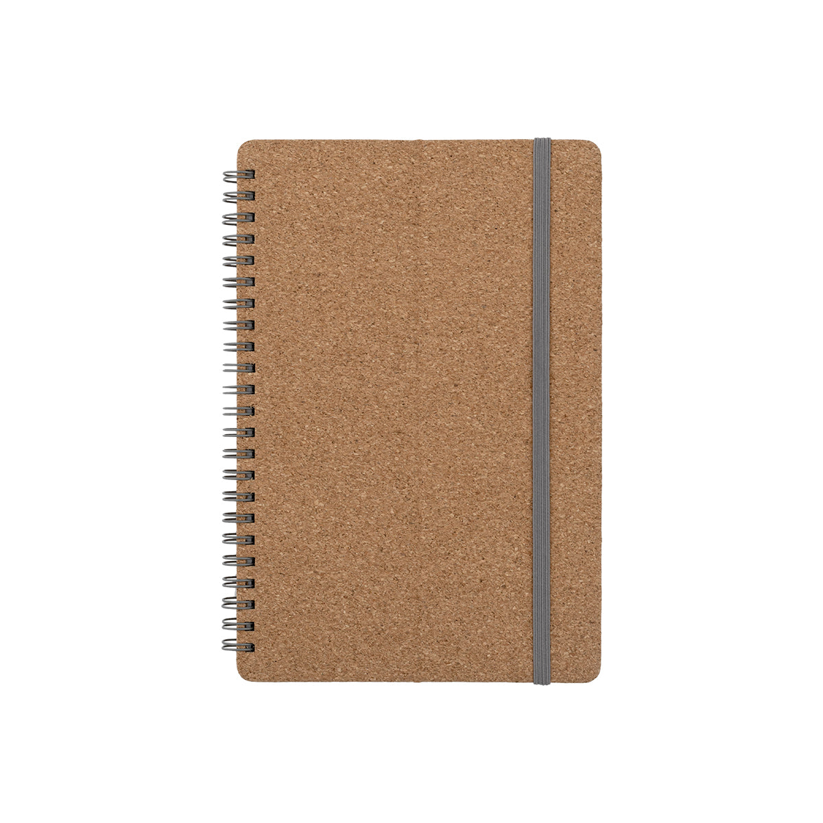 Libreta con pasta plegable de corcho y pasta interna de fibra de trigo, espiral metálico, 80 hojas rayadas de 70 gr. y banda elástica. La pasta principal e interna actúan como soporte para celular. Tamaño A5.