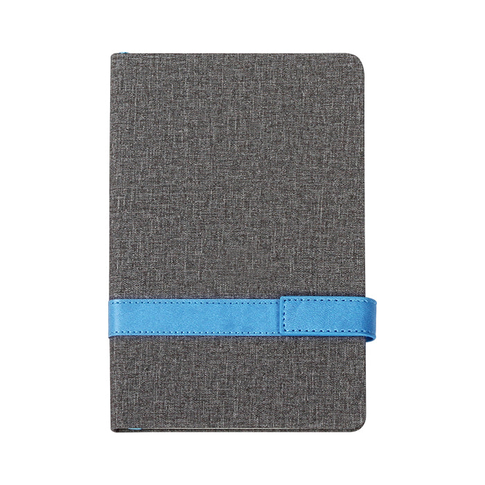 Libreta fabricada en tela, con broche de color en curpiel . Cuenta con separador de hojas el cual va a juego con el broche para cerrar , 80 hojas de raya. Tamaño A5.