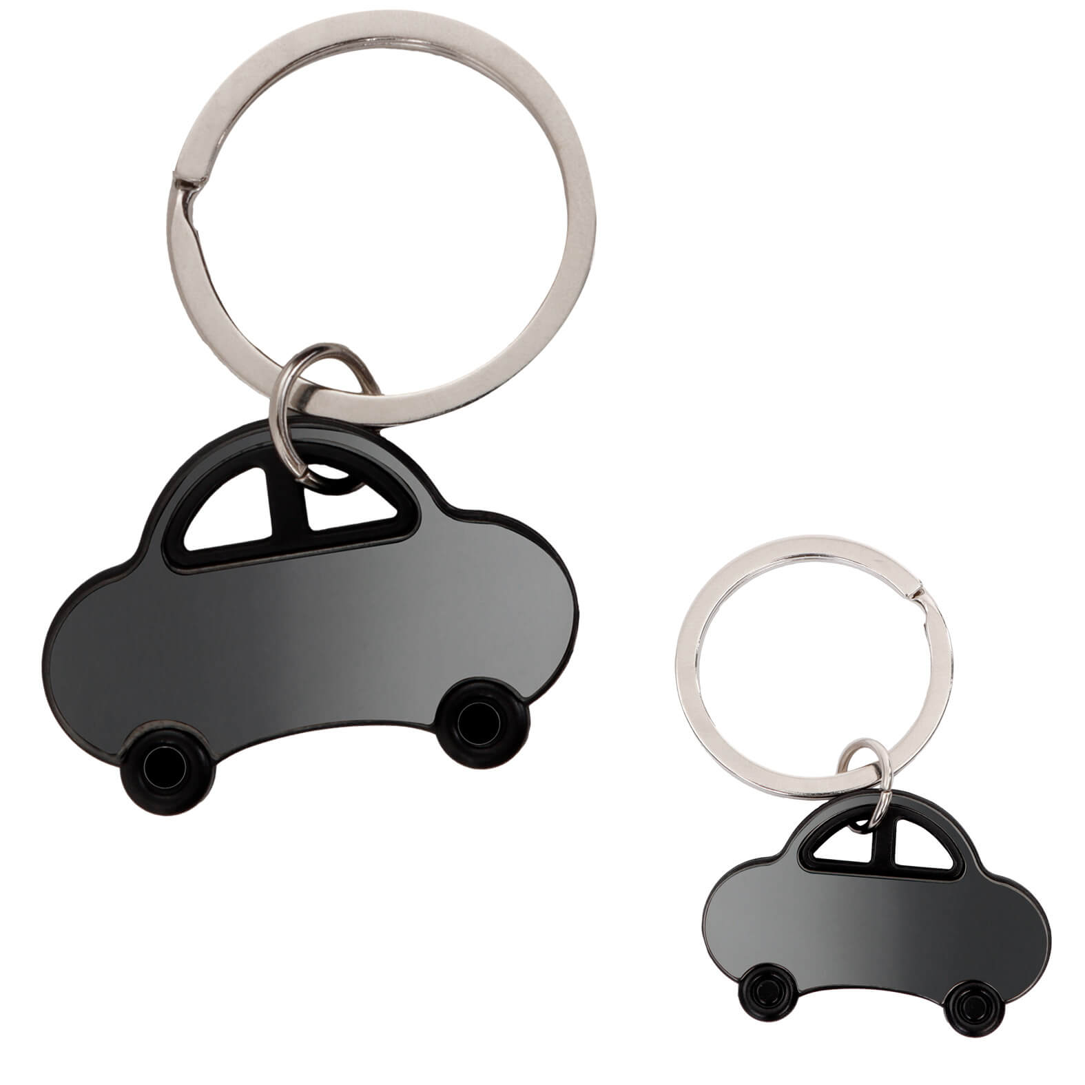 Llavero metálico con diseño en forma de automóvil y acabado espejo.. Medida producto alto: 3 . Medida producto ancho: 4.2 . Area impresion: 2 x 0.7 cm
