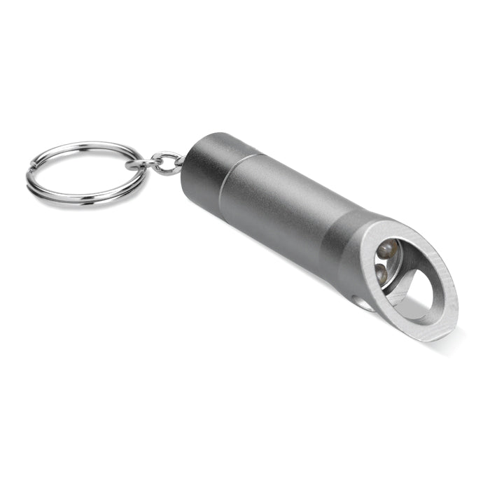 Linterna LED con destapador de botellas y llavero fabricados de metal. Incluye 3 pilas.