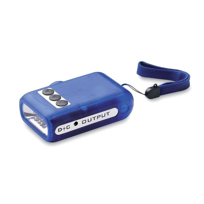 Linterna LED de mano con cargador USB para teléfono celular y dinamo. No utiliza pilas. Incluye 5 adaptadores.