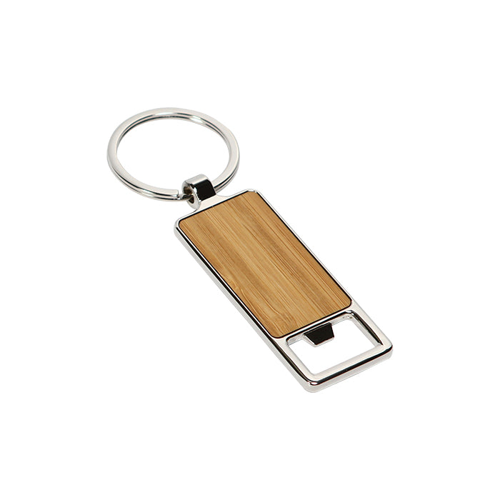 Llavero rectangular con placa de bambú rectangular que le da un aspecto orgánico y sostenible. Cuenta con un destapador incorporado, lo que lo convierte en un accesorio práctico para abrir botellas en cualquier momento.