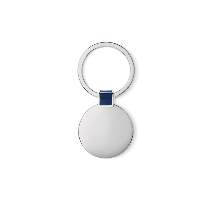 Llavero fabricado de metal con forma redonda, acabado en níquel brillante.