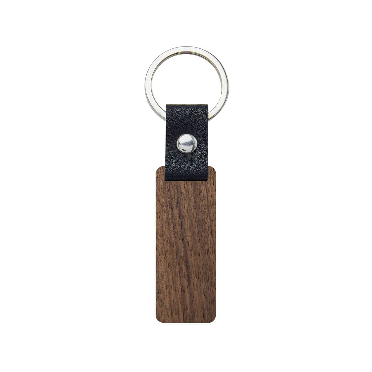 Llavero de madera con tira de curpiel. Incluye empaque con exhibidor de cartón y bolsa individual.. Medidas: 3.2 x 10.9 cm . Material: Madera de Nogal / Metal / Curpiel