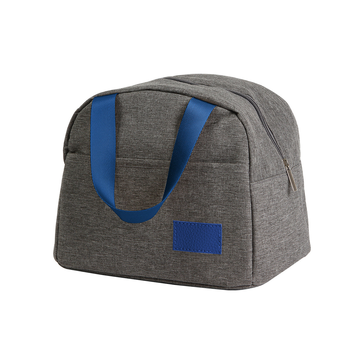 Lonchera fabricada en poliéster catiónico con forro de aluminio, Correas de nylon, bolsillo frontal y detalle en curpiel.