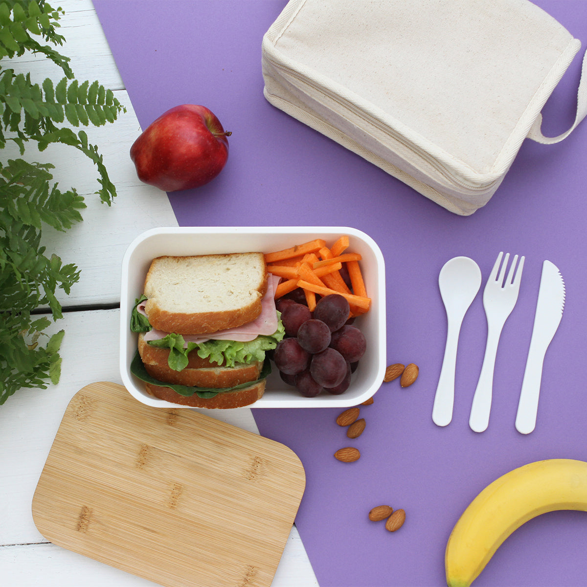 Bolsa de algodón térmica con contenedor para alimentos, cubiertos, cierre y correa. Nuestra practica lonchera es ideal para mantener tus alimentos y bebidas frescos durante tus actividades al aire libre. Su correa ajustable te permite llevarla cómodamente en el hombro o cruzada. Incluye un recipiente con acabados de bambú en su interior,  cuenta con un resorte sujetador de cubiertos, que te permite asegurar los utensilios y evitar que se muevan o se pierdan durante el transporte.  Se incluyen cubiertos prácticos y fáciles de limpiar.