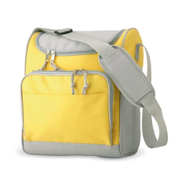 Lonchera con hielera fabricada de poliéster 600D, con bolsillo frontal. Material de aislamiento: papel de aluminio. Capacidad 13L.